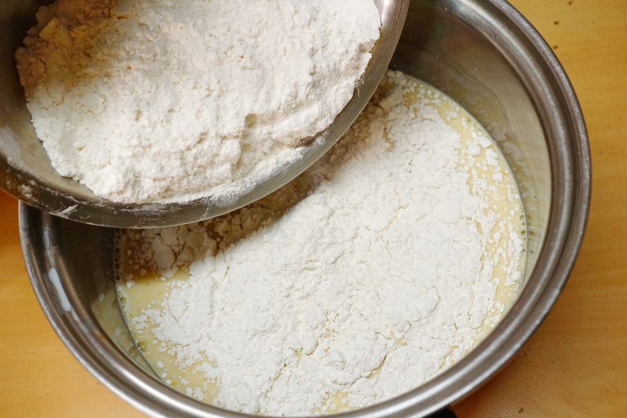 3. ใส่แป้งสาลีอเนกประสงค์ แป้งข้าวเจ้า แป้งท้าวยายม่อม และเกลือป่นลงไปผสมให้เข้ากัน