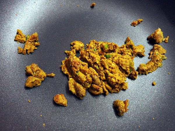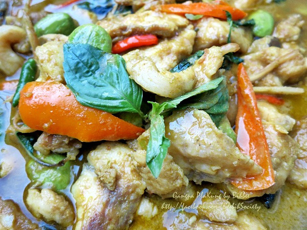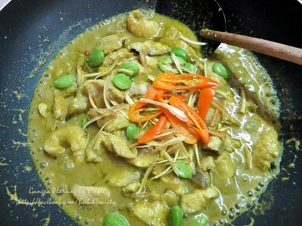 ใส่เนื้อปลาคัง (หรือเนื้อสัตว์ต่าง ๆ) ลงผัดให้สุก แล้วเติมหางกะทิ 1 ถ้วยลงไป (ถ้าเนื้อปลาสดเวลาผัดไม่ต้องกลัวว่าเนื้อปลาจะเละ)