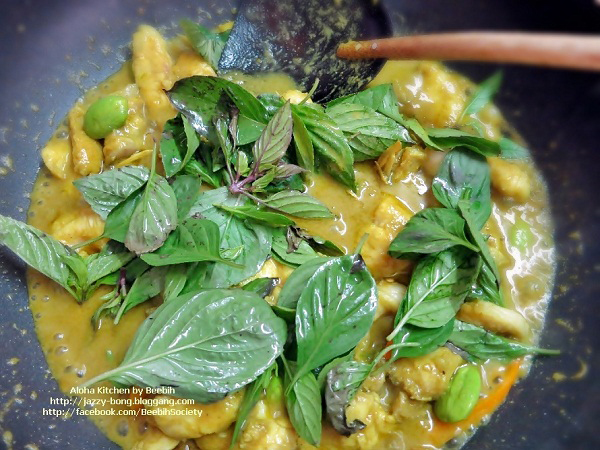 แบ่งใส่ใบโหระพาบางส่วนลงไป (ถ้าใส่ตอนปิดไฟแล้วจะทำให้ใบผักสีหมองคล้ำไม่สวย) คนผสมเบา ๆ ให้เข้ากันดี แล้วปิดไฟ (บ่งบ๊งจะแบ่งหัวกะทิไว้ส่วนหนึ่งแล้วเทใส่ไปในตอนสุดท้ายก่อนดับไฟ วิธีการแบบนี้สำหรับคนที่ไม่ชอบให้กะทิในแกงแตกมันลอยเอ่อขึ้นมา)