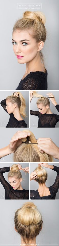 5. มวยผมแบบยุ่งแต่มีสไตล์ แค่รัดให้เป็นผมหางม้า พันผมไว้รอบๆโคน ติดกิ๊บให้แน่น