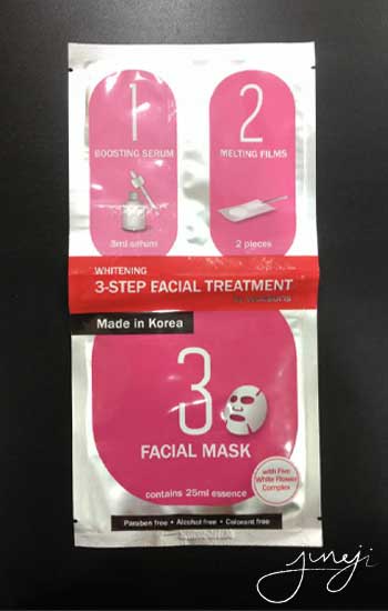 step 3 แผ่นมาส์กหน้า แผ่นหนาๆ มีส่วนที่เอามาปิดตาได้ด้วย แต่ค่ะแต่ น้ำเอสเซนส์นั้นนนน เป็นสีเหลืองๆใสๆ เหนียวๆ และกลิ่นเหม็นๆเคมีมาก ตอนแรกชั่งใจจะใช้ดีมั๊ย คือเหมือนของเสียมาก หาวันหมดอายุก็ไม่มี แต่ด้วยความงก ก็กลั้นใจแปะลงบนหน้า