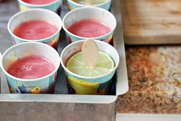 4.เทนำแตงโมที่กรองเอากากออกเรียบร้อยแล้วนำลงมาใส่แม่พิมพ์และนำไม้ไอติมที่เสียบด้วยมะนาววางบนน้ำแตงโมตามรูป