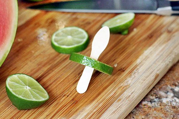 แล้วนำไม้ไอติมเสียบเข้าตรงกึ่งกลางซีกมะนาวตามรูปภาพ