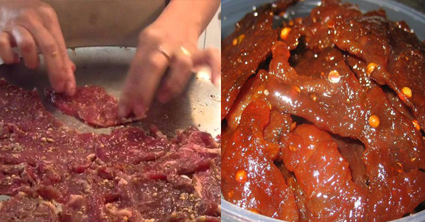 4 เรียงเนื้อบนตะแกรงผึ่งแดดให้แห้งพอหมาดๆ นำไปทอดในน้ำมัน