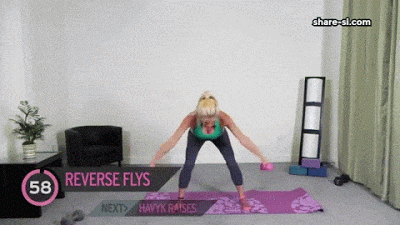 ยืนงอเข่า วางปลายเท้าห่างกันเท่าช่วงไหล่ โน้มตัวมาด้านให้สุดจนขนานกับพื้น หลังเหยียดตรง แขนทั้งสองข้างปล่อยลงในแนวดิ่งตั้งฉากกับพื้นพร้อมเวทในมือ จากนั้นให้ยกแขนทั้งสองขึ้นไปด้านข้างพร้อมหายใจเข้าช้าๆ ยกให้สูงจนอยู่ระนาบเดียวกับช่วงไหล่ จากนั้นค่อยๆลดแขนลง กลับสู่ท่าเริ่มพร้อมหายใจออก ทำซ้ำจนครบ 1 นาที หรือประมาณ 12-15 ครั้ง