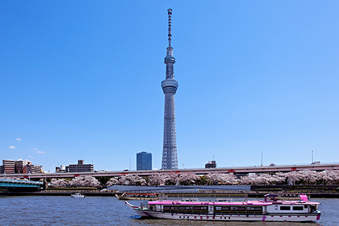 บรรยากาศที่เข้ากันของต้นซากุระที่เรียงรายขนาบข้างแม่น้ำสุมิดะ