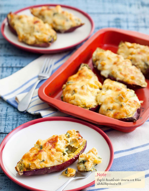 คุณแฟนซื้อมันเทศมาหลายกิโลฯ คิดได้เพียงเอาไปต้ม หรือนึ่งกินเล่น ๆ ไม่เช่นนั้นก็เอาไปทำเมนูแกงกะหรี่ หรือแกงมัสมั่น นอกจากเมนูมันเทศเหล่านี้มีแบบอื่น ๆ ที่น่าลองทำอีกไหม ใครรู้ช่วยตอบที เราขอนำเสนอวิธีทำมันเทศอบ (Healthy Sweet Potato Baked) สูตรจาก นิตยสารแม่บ้าน สูตรนี้นำเนื้อมันเทศผสมกับครีมชีส เสร็จแล้วจับไปผัดกับผักโขมและถั่วลูกไก่ ตบท้ายด้วยการโรยชีสให้ทั่วก่อนนำไปอบจนชีสเยิ้ม จัดเสิร์ฟในเปลือกมันเทศเก๋ ๆ เหมาะทานเล่นมาก ๆ เลยจ้า