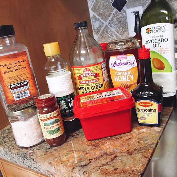 น้ำมันงา 1/2 ช้อนโต๊ะ          โคชูจัง 1 ช้อนโต๊ะ + 1/2 ช้อนโต๊ะ          น้ำซุปก้อนแช่แข็ง หรือน้ำเปล่า 2 ช้อนโต๊ะ (ใส่เพิ่มได้ถ้าอยากได้ซอสเยอะ ๆ)          น้ำผึ้ง 1 ช้อนโต๊ะ (ใครไม่มีก็ใส่น้ำตาลทรายค่ะ)          ซอสปรุงรส ปริมาณตามชอบ แต่อย่าใส่เยอะเพราะกิมจิเค็มอยู่แล้ว          น้ำแอปเปิลไซเดอร์ (หรือน้ำส้มสายชูหมัก) 1 ช้อนโต๊ะ หรือปริมาณตามชอบ           พริกป่นและพริกไทย ปริมาณตามชอบ